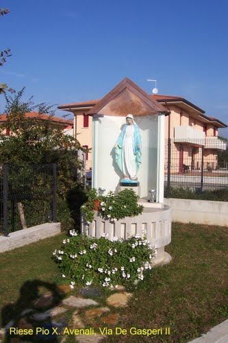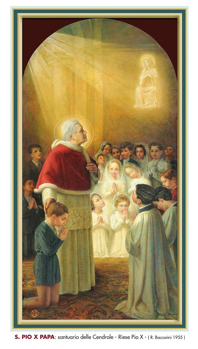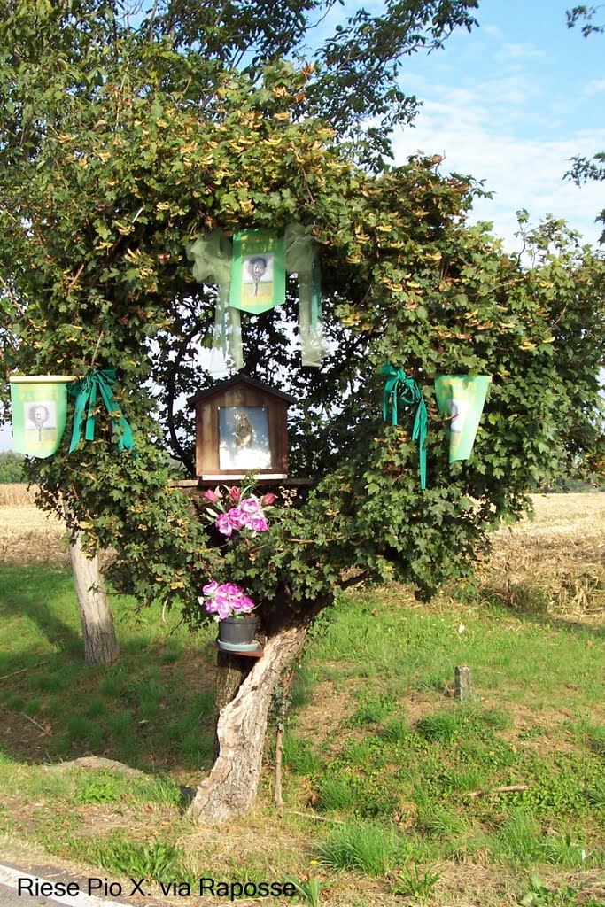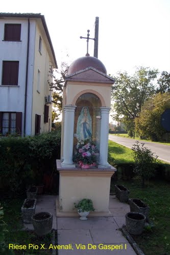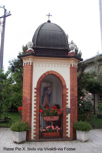 Statua bronzea di San Pio X, del peso di 240 kg e un’altezza di 210 cm, posta il 6 aprile 2014 in viale Monte Grappa, nella circonvallazione a nord di Riese, simbolicamente alle porte del paese. Un’immagine imponente e suggestiva che coglie subito il passante, inducendolo alla riflessione. Veste in abiti pontificali, l’atteggiamento è benedicente, con sguardo rivolto ai luoghi che portava nel cuore: il Santuario delle Cendrole e il Monte Grappa.