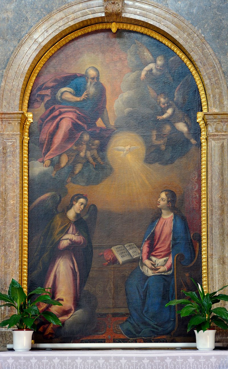 In alto a sinistra è dipinto Dio Padre che invia l’Arcangelo Gabriele (sotto a sinistra) a chiedere a Maria (che si trova in basso a destra, diagonalmente opposta a Dio Padre) la disponibilità a diventare la Madre del Messia.