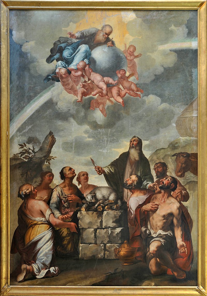 La sua prodigiosa velocità nel dipingere quasi sempre con alta ed impeccabile qualità (egli stesso diceva di usare tre pennelli: uno d'oro, per papi e monarchi; uno d'argento, per l'aristocrazia; ed uno di bronzo per la borghesia), gli permise d’essere chiamato a lavorare in numerosissime città italiane e all'estero, risiedendo infatti per un decennio alla corte di Spagna (1692-1702). L’opera ascrivibile a Luca Giordano conservata a Cendrole, come sembrerebbe confermare la numerazione posta sul recto della tela (tipica delle opere, dopo il periodo napoleonico, ricoverate presso le Gallerie dell’Accademia di Venezia, al seguito della soppressione di numerosi istituti religiosi in città e nel Veneto), dovrebbe provenire da Venezia, giunta da noi probabilmente grazie all’intervento di Jacopo Monico (come abbiamo già visto per le due tele del Diziani). Collocata sulla parete laterale del presbiterio, raffigura Il sacrificio di Noè ed è stata eseguita con stilemi figurativi ancora legati ad un classicismo d'impronta romana e bolognese, databile, pertanto, forse al periodo del suo primo soggiorno veneziano (verso la fine degli anni Sessanta del Seicento).